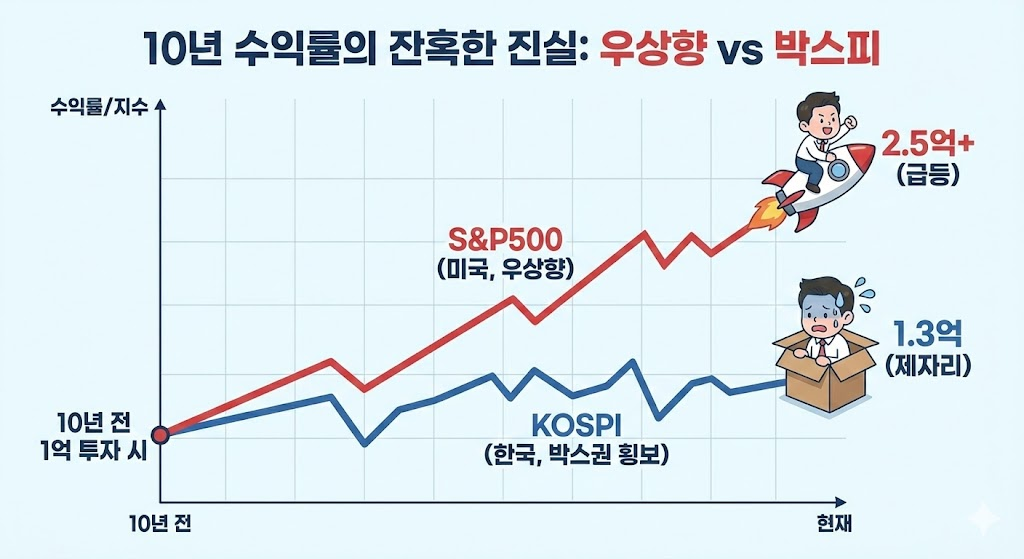 지난 10년간 한국(코스피)과 미국(S&P500) 시장에 똑같이 투자했다면 결과는 어떻게 달랐을까요?